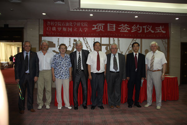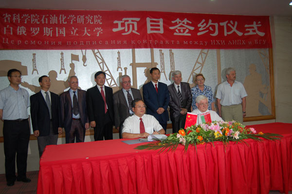 ?2011年6月16日,在省、市及科学院领导的高度关注下,黑龙江省科学院石油化学研究院(以下简称省石化院)与白俄罗斯国立大学间的科技合作项目“宽温液晶混合物制备技术”签约仪式在哈尔滨国际会展中心隆重举行。签约仪式由省科学院副院长王钢同志主持,黑龙江省副省长孙尧应邀出席并见证了签约仪式。省科学院院长潘忠、对外合作处处长高德玉、白俄罗斯国家科学院副院长亚力山大茨冈诺夫、副校长伊瓦什克维奇院士、省石化院院长白雪峰、副院长韩大维,及各单位相关人员出席了签约仪式。