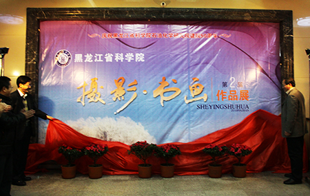 在大家的热烈掌声中,省科学院王刚副院长和石化院的白雪峰院长一起缓缓揭开了挂在“黑龙江省科学院第二届摄影书画作品展”背景墙上的红绸, 并预祝此次摄影书画作品展圆满成功。