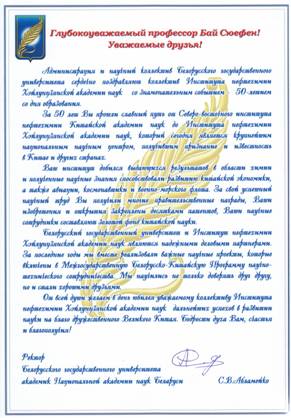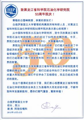 2012年12月13日,白俄罗斯国立大学副校长、院士伊瓦什科维奇一行三人组成的代表团不远万里,专程来到哈尔滨,参加黑龙江省科学院石油化学研究院建院五十周年庆典活动,并带来了白俄罗斯国立大学校长、院士谢?弗?阿勃拉梅科亲笔签署的贺信和礼物。