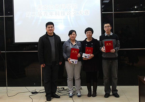 2013年12月12日,由省科学院学术信息处主办,《黑龙江科学》期刊编辑部等多家单位协办的黑龙江省科学院2013青年科技论文大赛圆满落下帷幕,省科学院各院所参赛的21名青年科技人员经过一天的紧张角逐,我院参赛选手朱金华、张雪、赵明三名选手表现优秀,获得本次大赛二等奖。