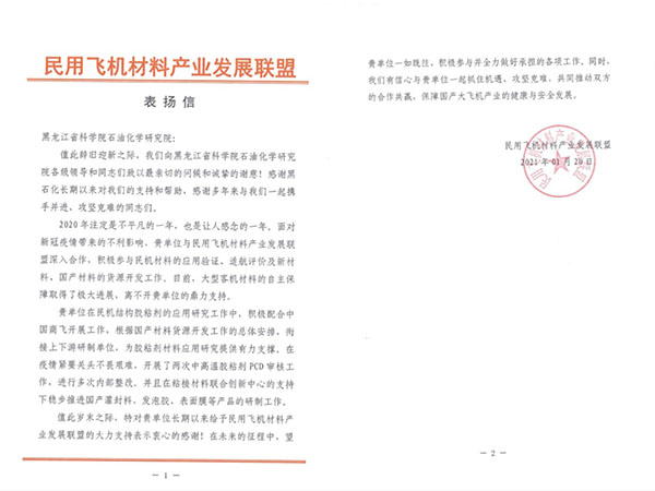 日前,黑龙江省科学院石油化学研究院收到民用飞机材料产业发展联盟致谢信,对我院在民机结构胶粘剂领域所做工作给予表扬。